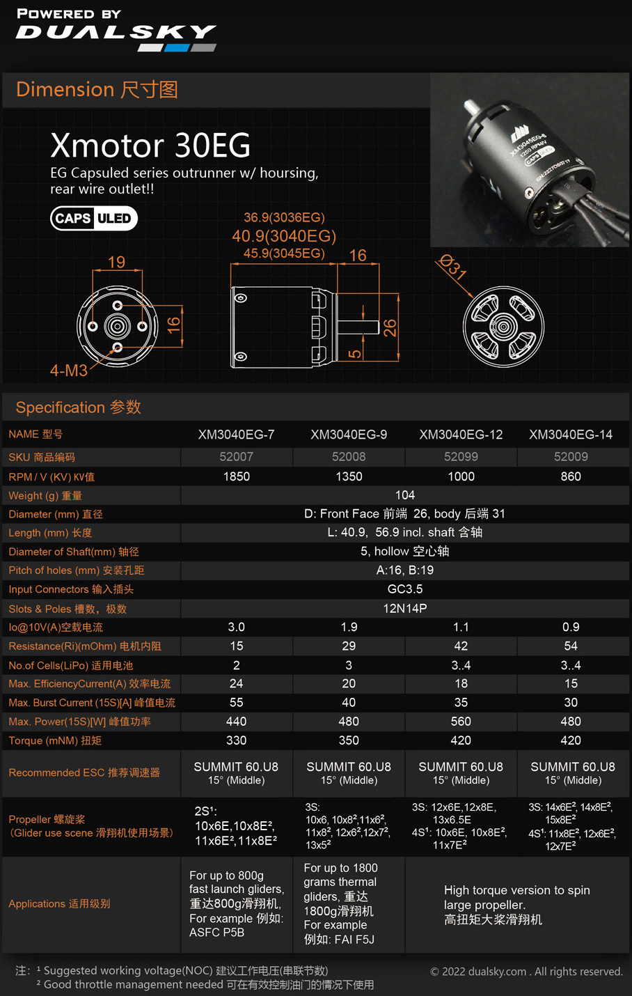 I find the new Dualsky 3040 EG,860Kv. motor an excellent choice for upgrading the standard Phoenix motor. Plenty of torque,smooth,well balanced,and plenty of power. This motor is an ideal unit for any powered sailplane,glider,and would power any type of plane weighing under 1.2 Kg. Acro,3D,aerobatic. Also any sailplane,glider,up to 2.0 Kg. A well designed,well manufactured motor ideal for "foamies" and other planes. Congratulations Dualsky on the new EG 3040 860 Kv. A small but powerful,high torque motor.